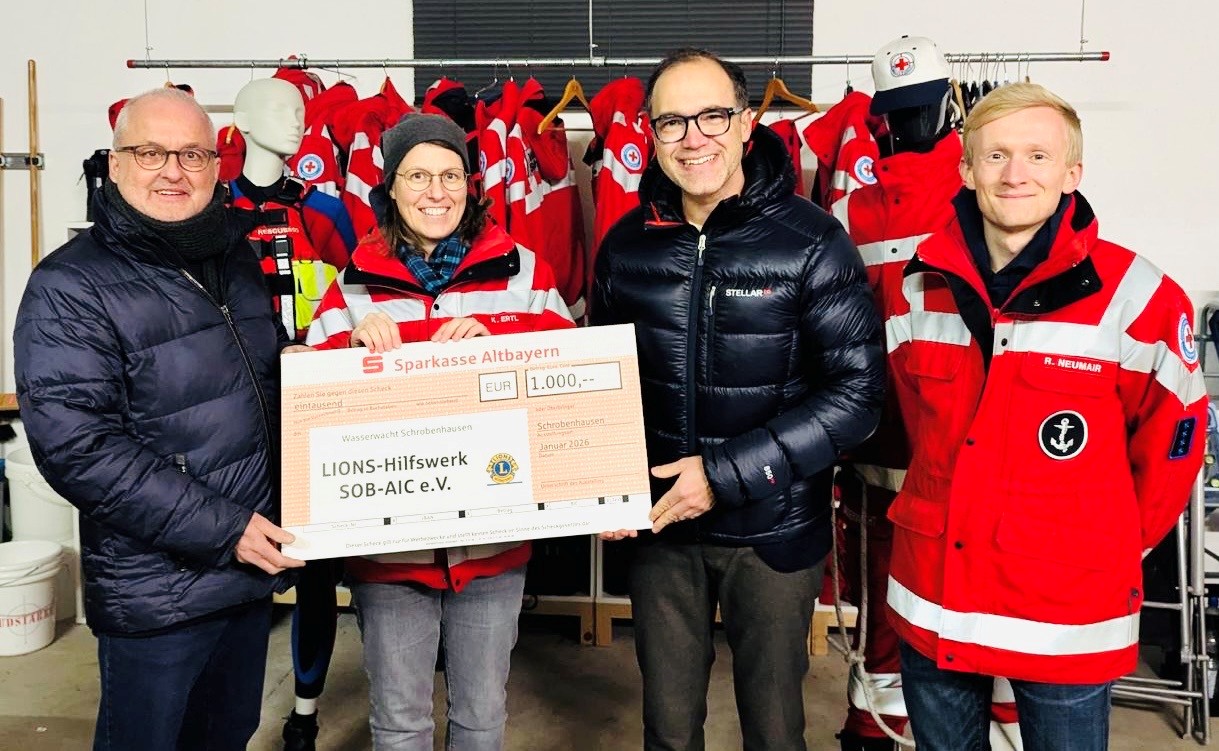 Mit einer Spende in Höhe von 1.000 Euro unterstützt der Lions Club Schrobenhausen-Aichach die Wasserwacht Schrobenhausen. Damit wurde ein erster wichtiger Schritt zur Finanzierung einer neuen Unterwasserdrohne getan, die künftig bei Vermisstensuchen und Rettungseinsätzen eingesetzt werden soll. Die Spende leistet einen wertvollen Beitrag zur Stärkung der Menschenrettung und erhöht die Sicherheit im örtlichen Einsatzgebiet.
